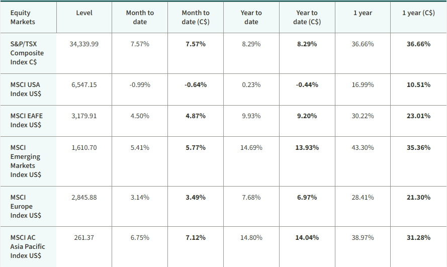 The S&P/TSX Composite Index delivered a strong return over the month, reaching new record highs. U.S. equities posted a small decline. Yields on 10-year government bonds in Canada and the U.S. declined. Oil prices finished higher over the month, as did the price of gold.